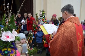 Najbardziej uroczysty charakter miała Msza Święta o godz. 10.00. Rozpoczęła się przed wejściem głównym do kościoła, gdzie ks. proboszcz odczytał fragment Ewangelii opowiadający o triumfalnym wjeździe Pana Jezusa do Jerozolimy. Następnie odbyło się poświęcenie palm. W trakcie Liturgii Słowa została odczytana Męka Pańska z podziałem na role.