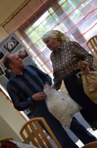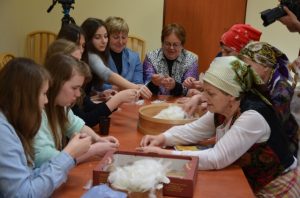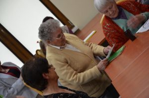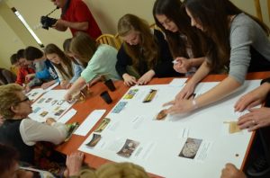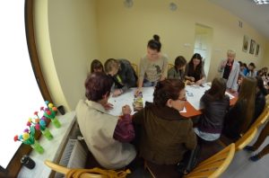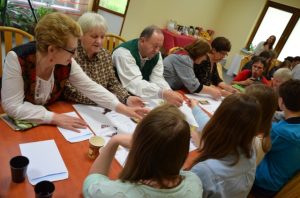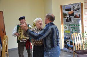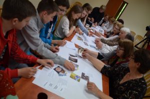 Tym razem młodsi i starsi uczestnicy zostali zaproszeni do zajęć związanych z gwara wiejską i obrzędem darcia pierza. Na początku wszyscy zebrani wysłuchali zabawnej godki w wykonaniu Pani Cecylii Korban. Później mieli za zadanie w zespołach międzypokoleniowych połączyć wyrazy z gwary ludowej z definicjami i fotografiami. Pojęcia zostały zaczerpnięte z książki Marianny Węgrzyn "Brzeziny. Nasza mała historia."