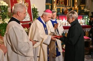 O godz. 17.00 wyruszyła procesja wejścia, w której parafianie Michał Bentkowski i Franciszka Nowak nieśli nowe złote korony dla Pana Jezusa i Matki Bożej. Ks. bpa Jana Piotrowskiego przywitała rodzina Machulskich z Brzezin i poprosiła o dokonanie rekonoracji poświęcenia nowych szat na wizerunku.