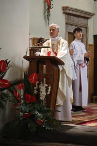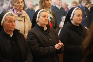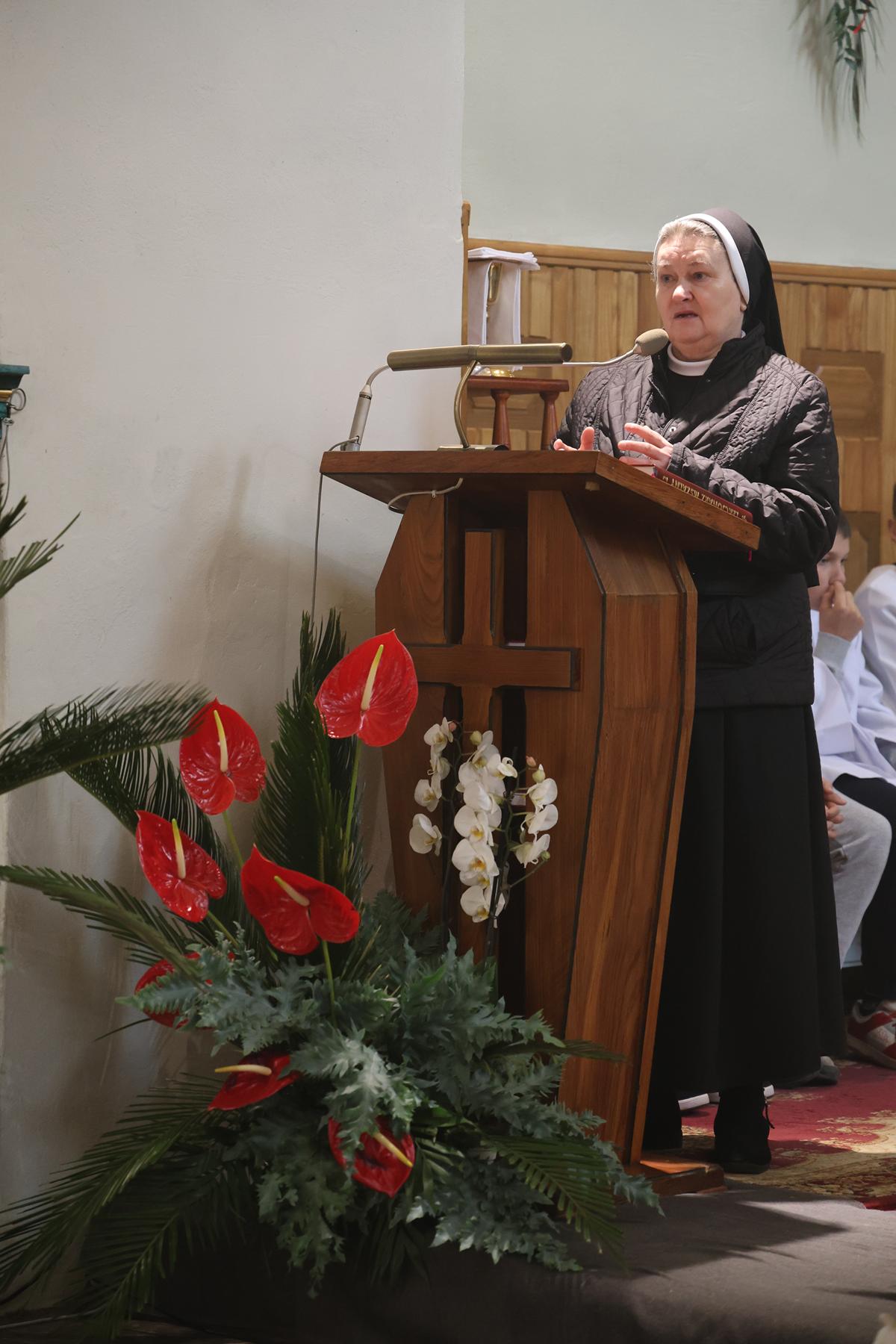 Ofiarę i misję Błogosławionych Męczennic przybliżyła podczas Eucharystii s. Róża Rusak CSC, mówiła - "Kochani jesteście w tej przepięknej świątyni otoczeni chwałą wszystkich Świętych. A dzisiaj chciałbym, żebyście do tego grona wzięli też nasze Błogosławione Męczennice, s. Krzysztofę i jej XIV Towarzyszek. To są ofiary II wojny światowej. To są ofiary męczeństwa Armii Czerwonej, która wkraczając na tereny Mazur, Powiśla, Pomorza miała taki przykaz 'zniszczcie wszystko, co napotkacie na drodze'. I tak ta armia czyniła. Kiedy 21 na 22 stycznia 1945 r. wkroczyła do Olsztyna, była mroźna wtedy zima. Zaczęło się plądrowanie, gwałty, kradzieże. W szpitalu (dawniej mariackim, obecnie Szpitalu Miejskim) pracowały nasze siostry. Pierwszą ofiarą była s. Krzysztofa, która do końca była przy chorych. Zresztą wszystkie siostry powiedziały tak 'Zostajemy do końca'. Chociaż miały wybór, bo każdy z nas ma jakiś wybór. Mogły uciekać, bo ludność uciekała z tamtych terenów, wiedząc, słysząc, doświadczając jak wielkie okrucieństwo niesie za sobą Armia Czerwona. One zostały do końca. Przypłaciły to śmiercią męczeńską. (...) W czasie wojny zginęło 105 naszych sióstr. Najmłodsza miała tylko 27 lat, najstarsza 65. I choć wojna się skończyła nasze siostry ginęły jeszcze w czerwcu, sierpniu, a ostatnia z nich, w nasze patronalne święto, 25 listopada. To była s. Ksaweria. (...) My dziś wyjedziemy do Braniewa, ale prosimy Was, niech te Siostry zostaną w zacnym gronie wszystkich Świętych. Weźcie chociaż jedną z tych Sióstr do swoich domów, do swoich serc, a zobaczycie, że nie będziecie zawstydzeni, bo one już przynoszą owoce swojej modlitwy wstawienniczej."