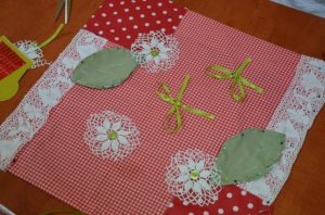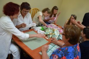 Druga część spotkania miała charakter praktyczny. Warsztat z patchworku (wykorzystującego szycie i haft) poprowadziła pani Monika Majkowska. W krótkiej prezentacji ukazała, jak można przy użyciu dawnych tradycyjnych przedmiotów i materiałów ciekawie aranżować wnętrza. Najwięcej emocji wywołała jednak praca ręczna. Cztery zespoły międzypokoleniowe (młodzież i seniorzy) miały za zadanie z różnych skrawków materiałów, koronek, tasiemek i guzików uszyć poszewki na poduszki. Zadanie okazało się nie takie łatwe i raczej pracochłonne. W efekcie jednak powstało sześć poszewek, które zostaną wypchane pierzem pochOdzącym z poprzedniego warsztatu. Docelowe znajdą się w Izbie Regionalnej.